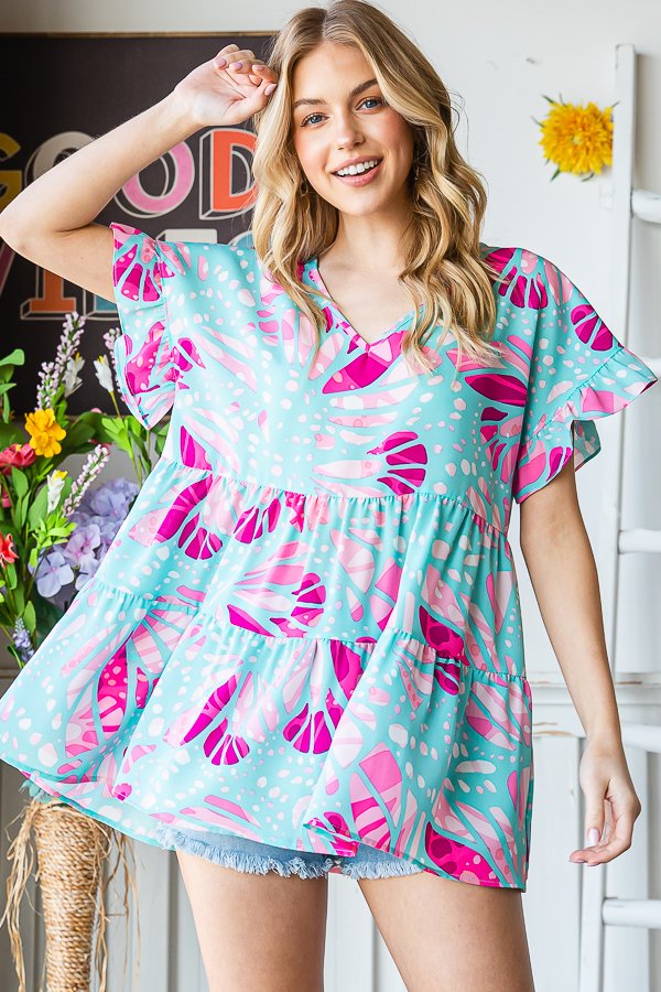 - - DOLMAN SHORT SLEEVE WITH RUFFLED V NECK GEOMETRIC PRINT TIERED TOP WITH SHIRRING DETAIL PLUS SIZE
