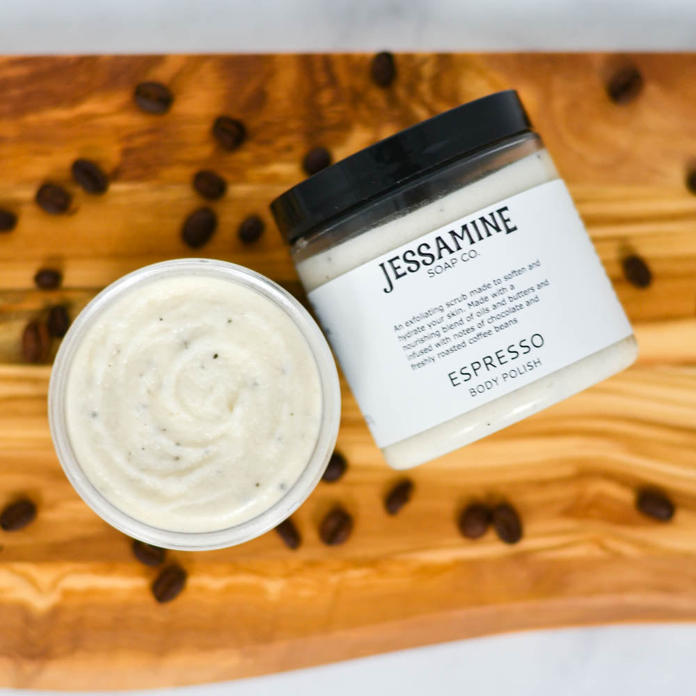 An exfoliating scrub to soften and hydrate your skin. Made with a nourishing blend of Coconut Oil, Avocado Oil, Mango Butter, and Shea Butter, and infused with notes of chocolate and freshly roasted coffee beans.