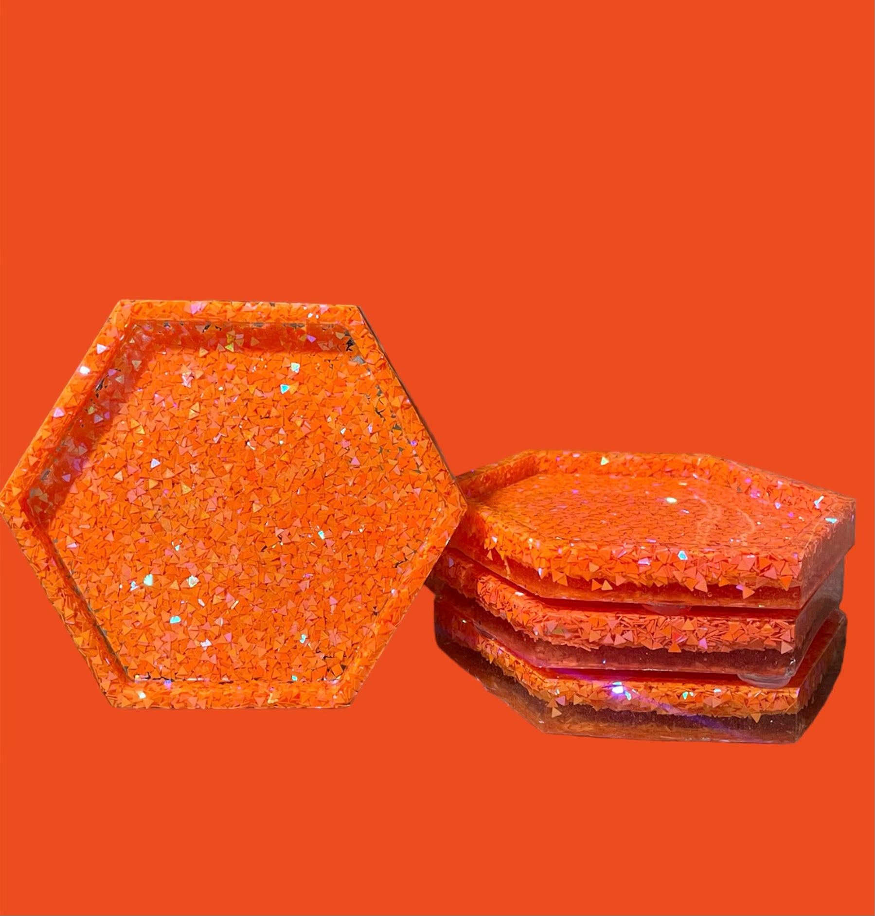 Protect your furniture in style with our Orange Hexagon Drink Coasters. These coasters are not just functional, but also add a pop of color to your home decor. With their unique hexagon shape, they provide a modern touch while preventing any spills or stains on your surfaces. Set of 2.